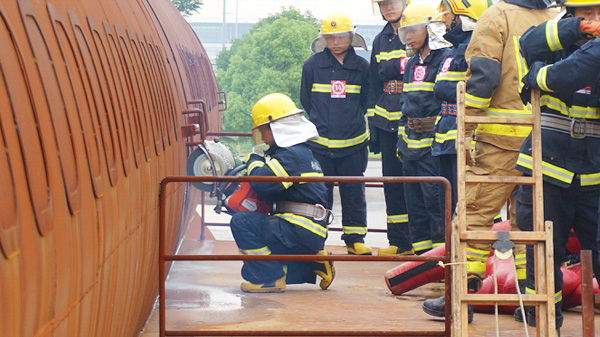教官詳細(xì)示范引擎火災(zāi)的撲滅技巧,參訓(xùn)學(xué)員仔細(xì)聆聽
