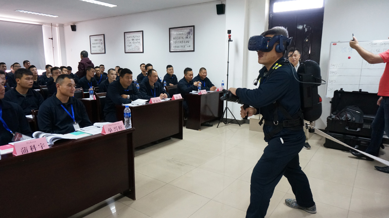 學(xué)員們在教室內(nèi)體驗VR滅火