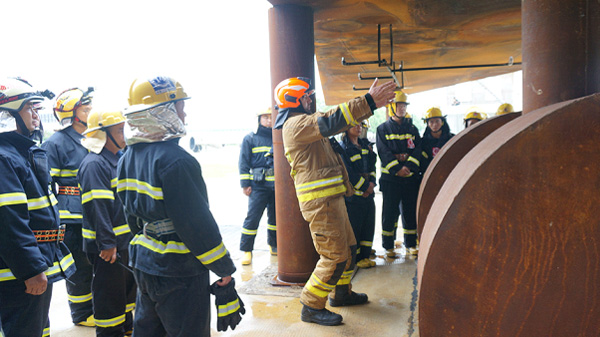 教官詳細(xì)示范引擎火災(zāi)的撲滅技巧,參訓(xùn)學(xué)員仔細(xì)聆聽